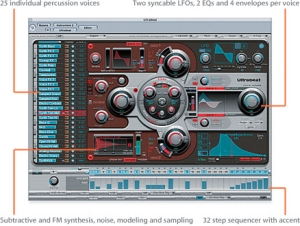 --新增的UltraBeat鼓機(jī),集減法、FM、建模、采樣合成方法于一身,帶重音控制的32段步進(jìn)音序器,最多24個(gè)pattern,最多25個(gè)聲部,每個(gè)聲部都有4個(gè)獨(dú)立的包絡(luò)發(fā)生器